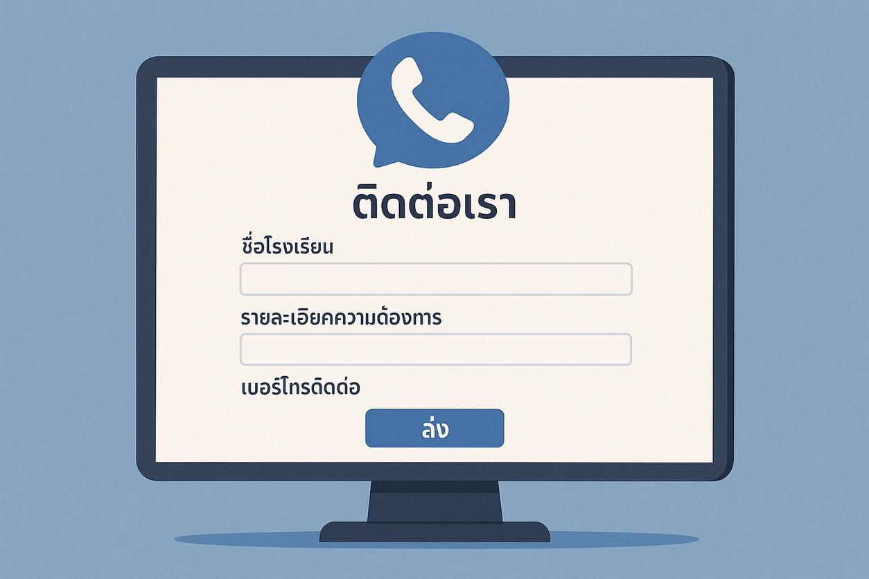 เมื่อเข้าสู่หน้าติดต่อ คุณจะพบกับฟอร์มออนไลน์ที่ออกแบบมาอย่างเข้าใจง่าย เพื่อให้คุณสามารถระบุรายละเอียดความต้องการต่างๆ ของโรงเรียนคุณได้ ฟอร์มนี้ประกอบด้วยช่องให้กรอกชื่อโรงเรียน ข้อมูลเกี่ยวกับฟีเจอร์ที่ต้องการระบุ เหตุที่คุณสนใจเพื่อพิจารณาบริการของเรา และช่องทางการติดต่อต่างๆ เช่น เบอร์โทรศัพท์หรืออีเมล เจ้าหน้าที่ของเราจะพิจารณาและจัดการเรื่องนี้อย่างรวดเร็ว เพื่อให้ได้คำตอบที่ตรงต่อความต้องการของคุณมากที่สุด