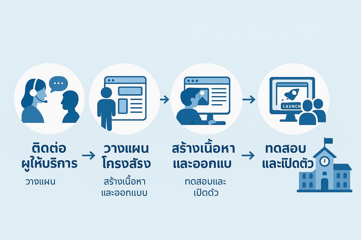 กระบวนการสมัครใช้บริการเริ่มต้นด้วยการติดต่อผู้ให้บริการโซลูชั่นเว็บไซต์สำเร็จรูป โดยจุดเริ่มนี้สำคัญมาก เพราะถือเป็นโอกาสแรกที่โรงเรียนจะได้วางแนวทางความต้องการและงบประมาณเบื้องต้น ในขั้นตอนการติดต่อ คุณสามารถระบุเหตุผลและความต้องการเฉพาะของโรงเรียนเพื่อให้ผู้ให้บริการสร้างใบเสนอราคาที่สอดคล้องกับความต้องการจริง ๆ ซึ่งขั้นนี้เป็นการสร้างความเข้าใจที่ดีและเริ่มต้นการสื่อสารที่มีประสิทธิภาพกับทีมงานเพื่อเตรียมความพร้อมในการพัฒนาเว็บไซต์