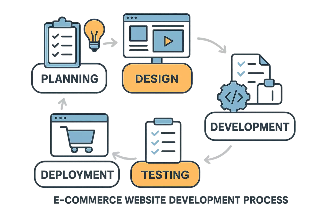 ขั้นตอนการพัฒนาระบบเว็บไซต์ E-Commerce เป็นกระบวนการสำคัญที่ต้องการความประณีตและความเข้าใจเชิงลึกเพื่อให้ได้เว็บไซต์ที่สมบูรณ์แบบและตอบโจทย์ความต้องการของธุรกิจออนไลน์ในปัจจุบัน ต่อไปนี้คือรายละเอียดของแต่ละขั้นตอนที่จำเป็นในการพัฒนาเว็บไซต์ E-Commerce ที่มีประสิทธิภาพ: